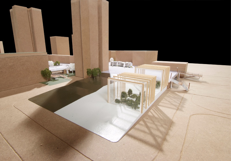 Nous proposons un système d’objets qui se décline en quatre échelles : une serre monumentale installée sur la place centrale de la dalle. Un jardin des cimes ou ensemble de passerelles qui cheminent à travers les cimes des arbres plantés à la périphérie de la dalle et enfin des serres de culture qui permettent d’entretenir des jardinières privatives.